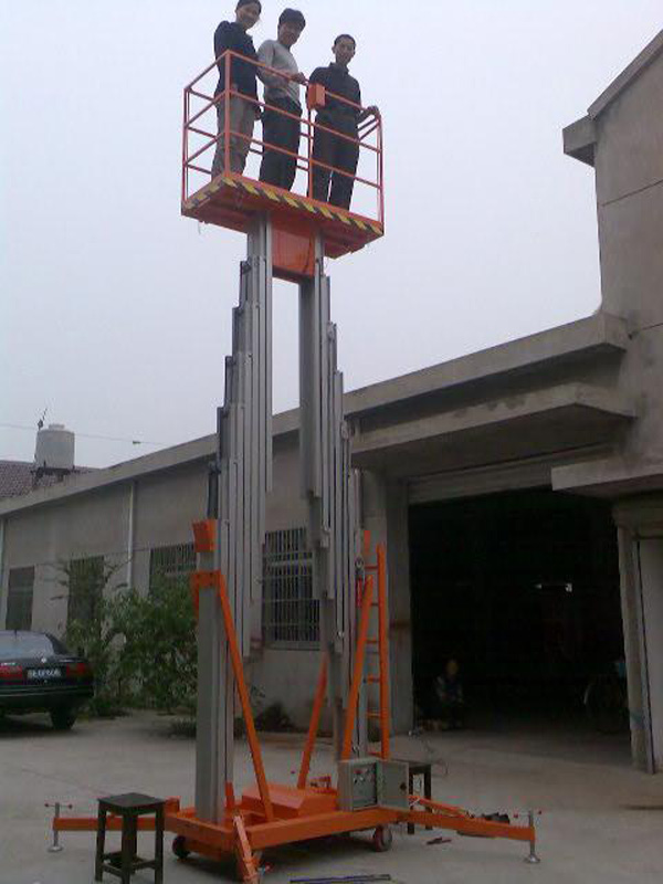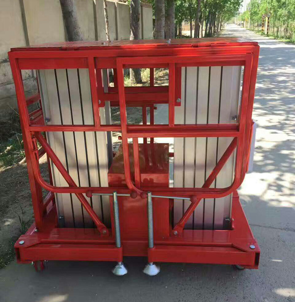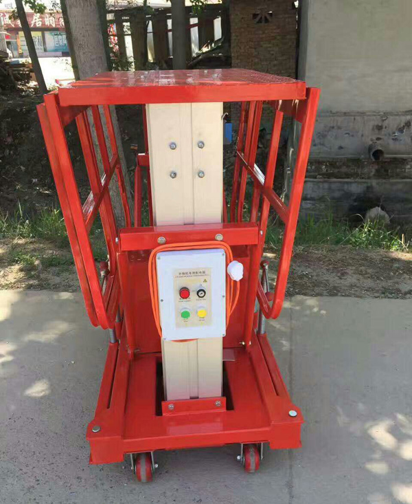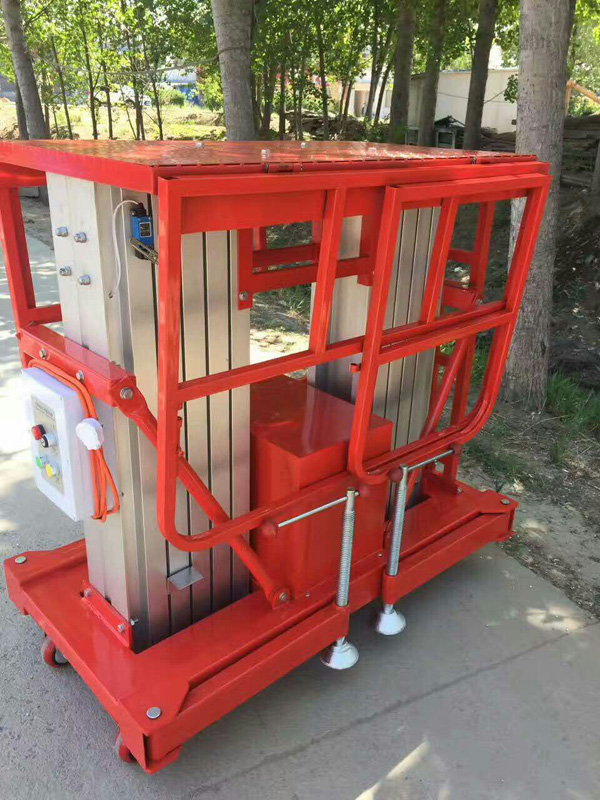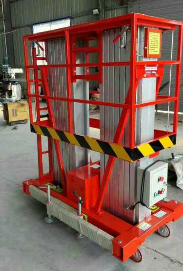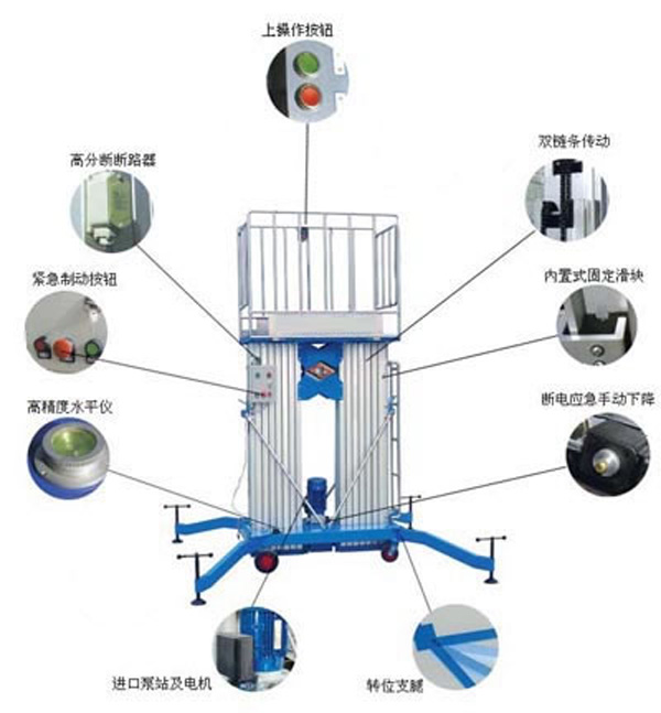 鋁合金升降機升高高度在8米以下為單跪柱式,在10米到14米之間為雙跪柱式,15米到18米之間則升為三跪柱式或四跪柱式。通過升降平臺跪柱的增加達到設備在高空的穩定性,保證作業安全,減小設備晃動的幅度,使高空作業更加平穩。該升降平臺配備了中德合資的液壓泵站,該泵站為壓鑄鋁集成閥塊,結構緊湊,系統壓力16MPa,選用密封件的精磨高壓液壓油缸作為主要升降動力,經過液壓泵站帶動鏈條傳動,結構合理,設計緊湊。鋁合金式液壓升降平臺下降速度可自調,而且設備設有手動下降裝置,保證在停電時的正常工作;設有應急停運按鈕;臺面設有防滑絕緣扣板,更換方便,易于清潔,維修方便,有效保障工作安全可靠,保證使用人員的安全。外形美觀,整體輕盈,能在小的空間內發揮好的舉升功能,也可根據客戶要求加裝蓄電池以滿足客戶工作場地的不同要求。