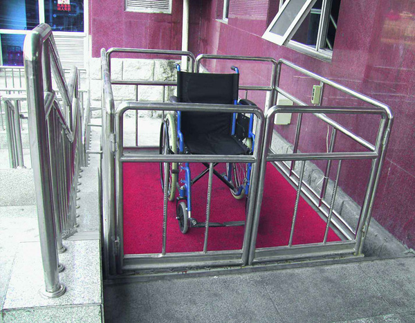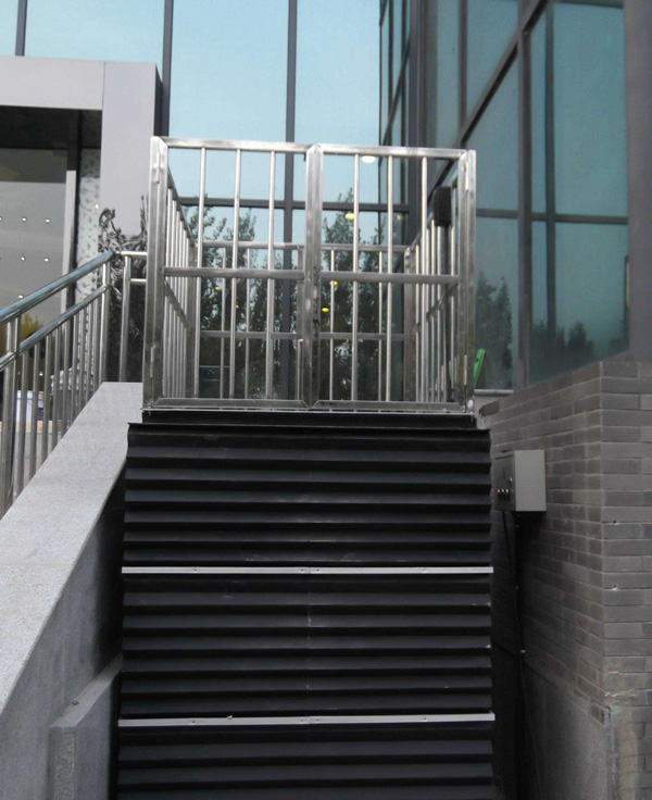 無障礙殘疾人升降機,主要是由導軌和升降平臺板組成的,類似一個簡易的小電梯。導軌是鑲嵌在通道出入口的墻壁上的,隨著樓梯的坡度向下延伸,一直到地道內部。而升降平臺在不使用時可以折疊靠著墻壁放置,這樣不會占用通道出入口處的空間。乘坐輪椅的殘疾人在使用時,輪椅四個輪子可以被固定在臺板上,按動開關后就可以控制升降平臺進入地下通道,安全方便。